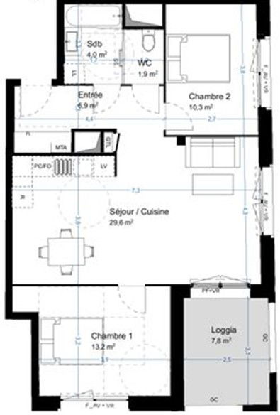 Ou T3 de 65.9m2 au 4ème orienté Sud loggia 7m2 Prêt à taux 0 pour résidence principale 294 000€